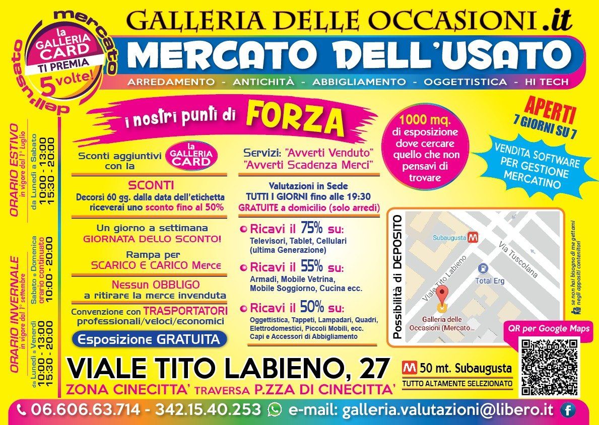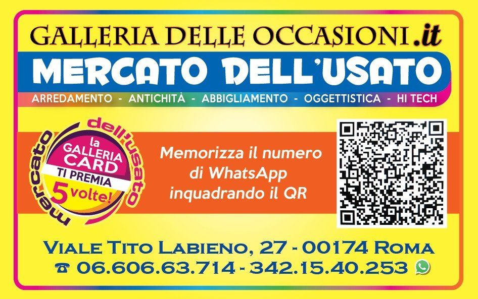 Visitate la sede della GALLERIA delle OCCASIONI di Roma per entrare a far parte del fantastico modo dedicato alla compravendita dell’usato dove potrete trovare tutto ciò che vi occorre a prezzi super vantaggiosi oppure per approfittare di valutazioni gratuite sugli oggetti usati che intendete vendere. Presso la sede potrete inoltre richiedere e ricevere gratuitamente a ‘Galleria Card’ grazie alla quale potrete accedere a tantissimi vantaggi ed offerte esclusive pensate e studiate appositamente per voi.